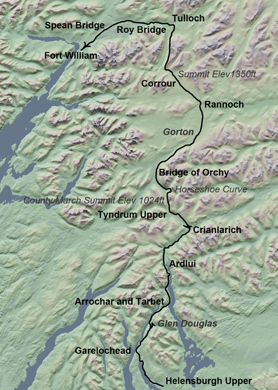 From Arrochar and Tarbet Station the line follows Loch Lomond. Running above Loch Lomond the line passes Loch Sloy hydroelectric power station. During the power station's construction there was a siding and station here. The line then crosses Creag an Ardain Viaduct, the only stone viaduct on the line, before entering Creag an Ardain Tunnel, the only tunnel on the line when it was originally constructed. The railway leaves Loch Lomond behind at Ardlui and starts its climb up Glen Falloch Summit before descending into Crianlarich.