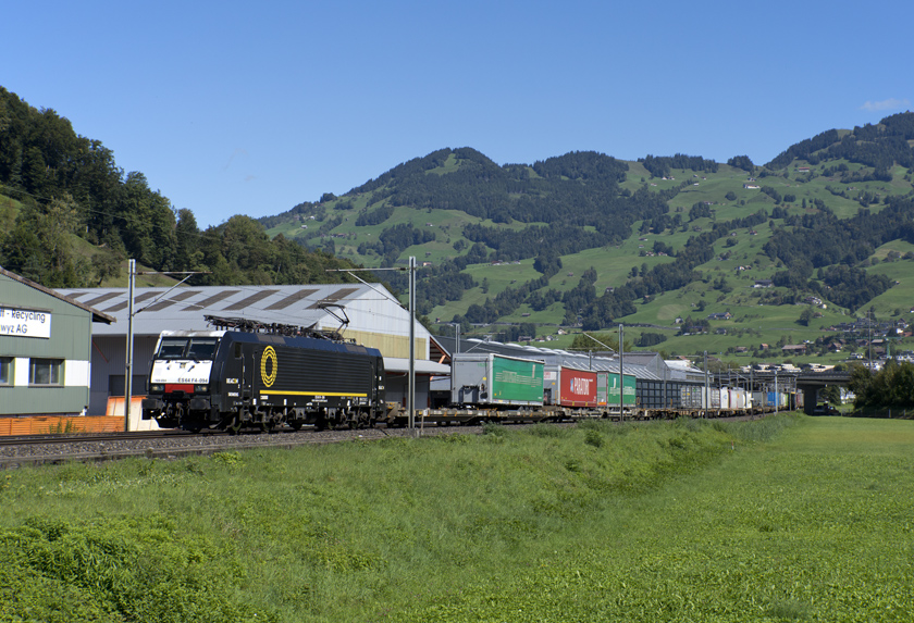 Beacon Rail 189 994 is seen leading a southbound intermodal between Schwyz and Brunnen - 15/09/2025