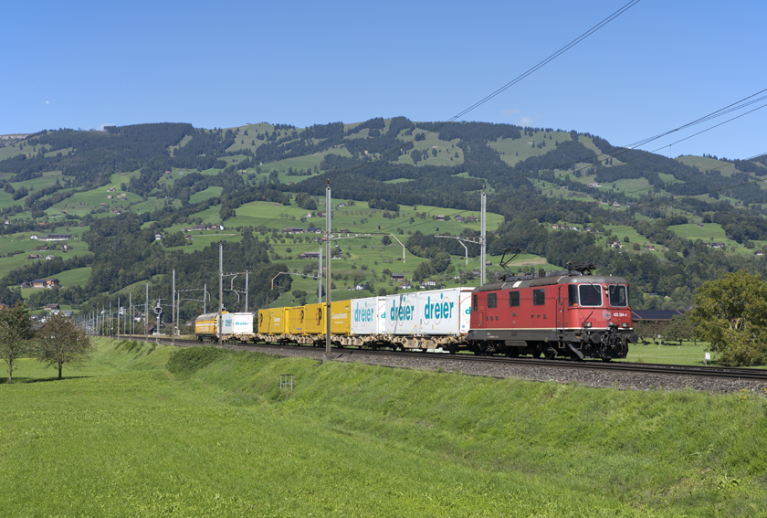 SBB Re4/4 II 420 264 (11264) is seen leading mail #50021 Harkingen-Cadenazzo away from Steinen - 15/09/2025