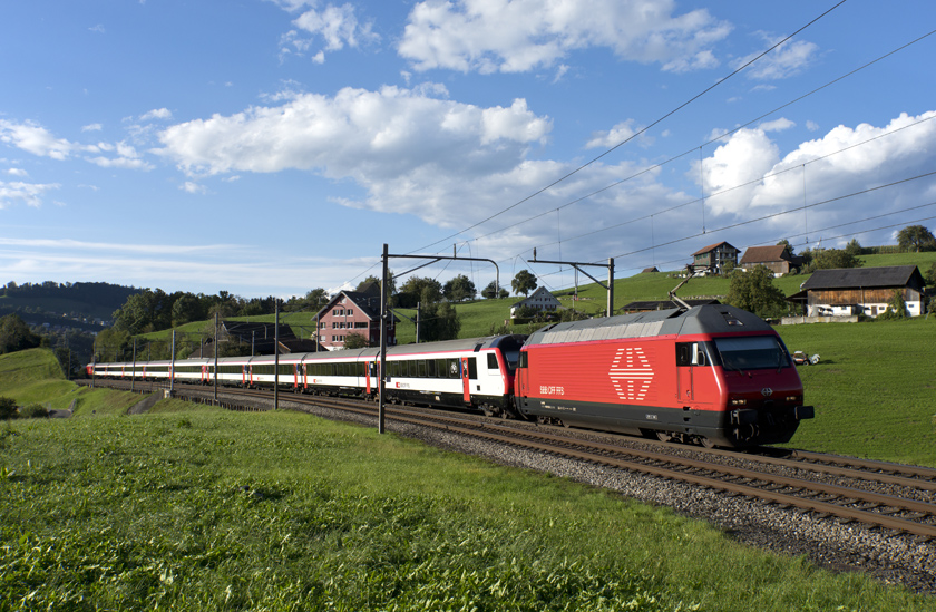 SBB Re460 042 is seen leading a southbound Intercity into Immensee - 15/09/2025