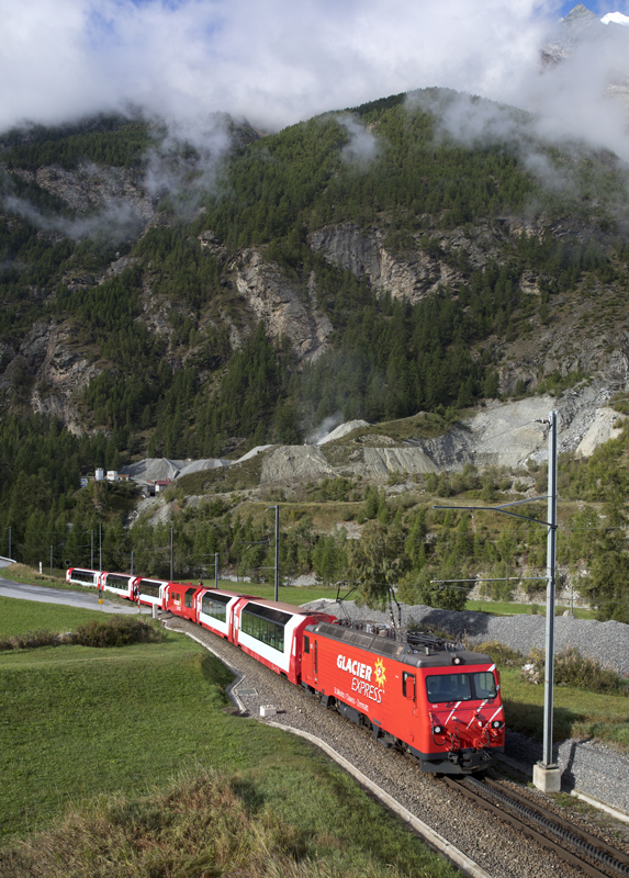 MGB HGe4/4 II 105 is seen leading Glaicer Express #904 Zermatt-St Moritz away from Randa - 16/09/2025