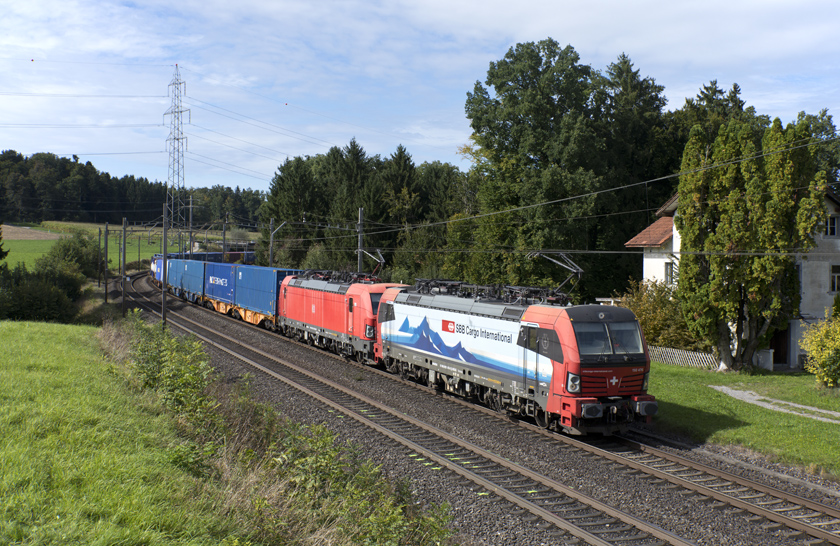 SBB Vectron 193 476 is seen leading a southbound intermodal at Mühlau - 17/09/2025