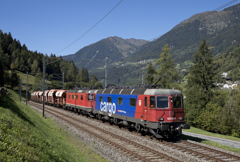 SBB Cargo Re6/6 620 013 (11613) and 620 037 (11637) are seen working train 67787 loaded stone to Bodio the only scheduled freight remaining over the Gotthard Pass descending the south ramp south of Ambri - 18/09/2025
