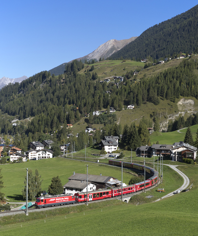 RhB Ge4/4 III 643 is seen leading a Chur-St Moritz out of Bergun - 19/09/2025