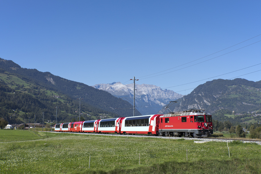 RhB Ge4/4 II 617 is seen leading a Zermatt-St Moritz 'Glacier Express' at Cazis - 19/09/2025