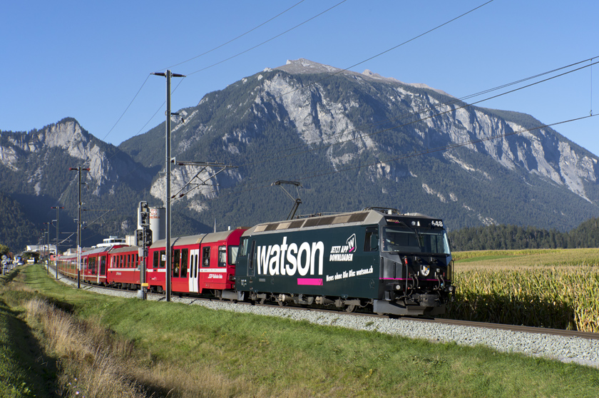RhB Ge4/4 III 648 is seen leading a Chur-St Moritz at Bonaduz - 19/09/2025