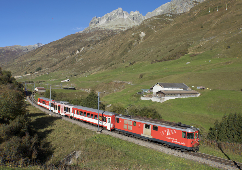 MGB Deh 4/4 52 is seen leading train 616 09:31 Realp-Goschenenn appraoching Hospental - 20/09/2025