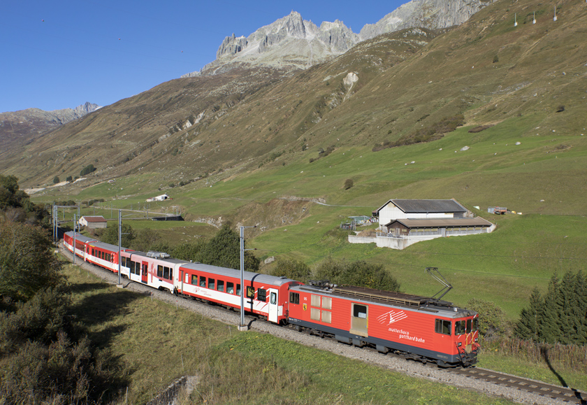 MGB Deh 4/4 95 is seen working train 533 Andermatt-Visp away from Hospental - 20/09/2025
