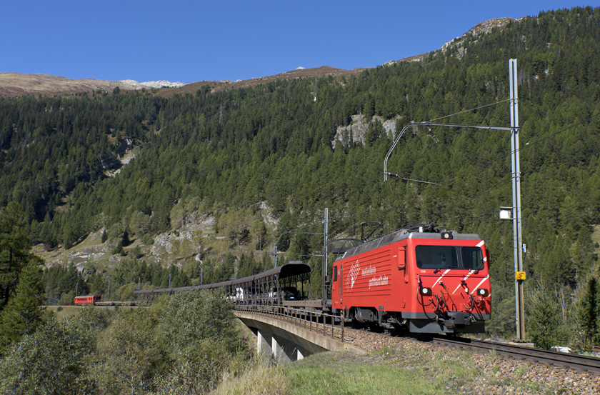 MGB HGe4/4 II 106 is seen leading car train A2436 12:09 Oberalp-Realp at Obergoms about to enter the Furka Basetunnel - 20/09/2025