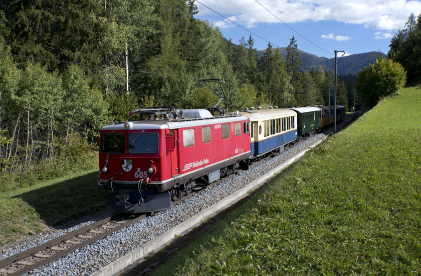 RhB Ge4/4 I 605 is seen leading Historic train 7815 Davos-Filisur into Filisur - 21/09/2025