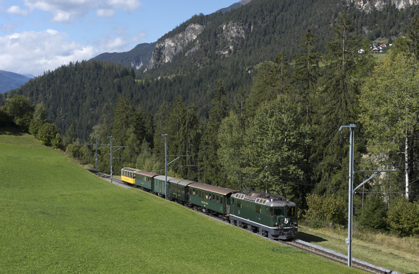 RhB Ge4/4 II 611 is seen leading an extra train from Filisur to Chur via Davos away form Filisur - 21/09/2025