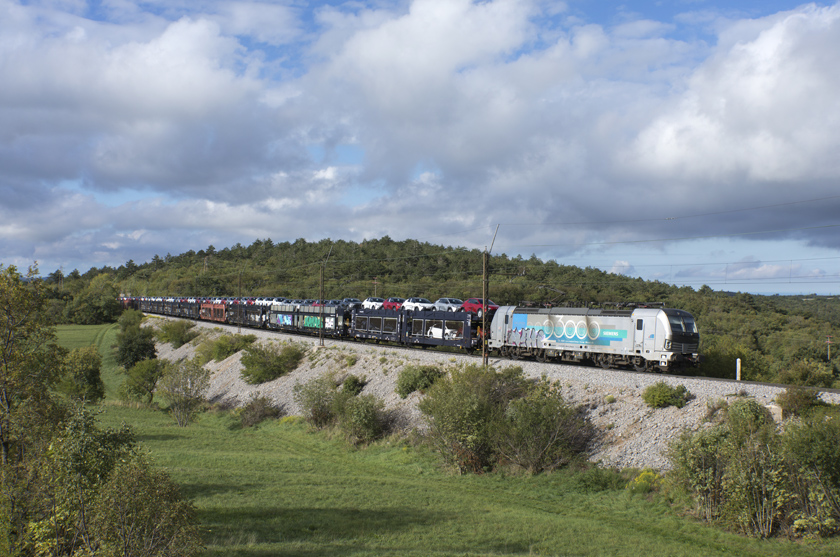 Railpool Vectron 6193 094 is seen leading an eastbound loaded car train climbing out of Koper at Prešnica - 25/09/2025