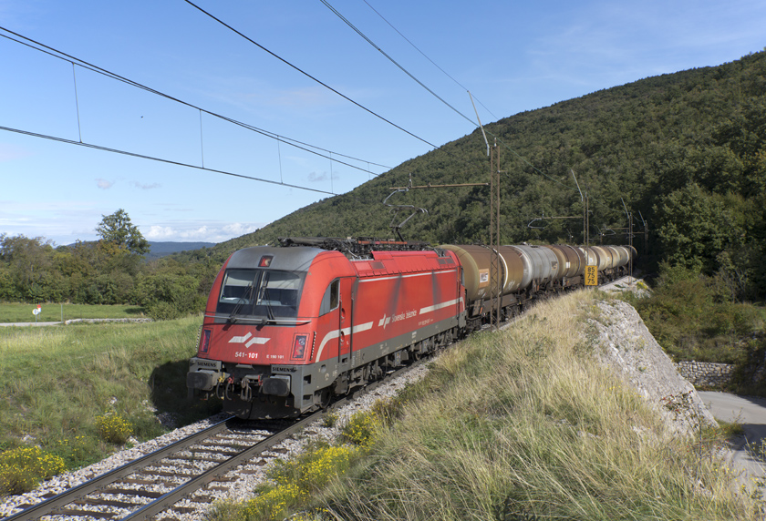 SZ 541 101 is seen leading a tank wagons bound for Koper downgrade at Prešnica - 26/09/2025