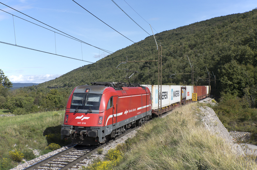 SZ 541 018 is seen leading an eastbound intermodal for Koper downgrade at Prešnica - 26/09/2025