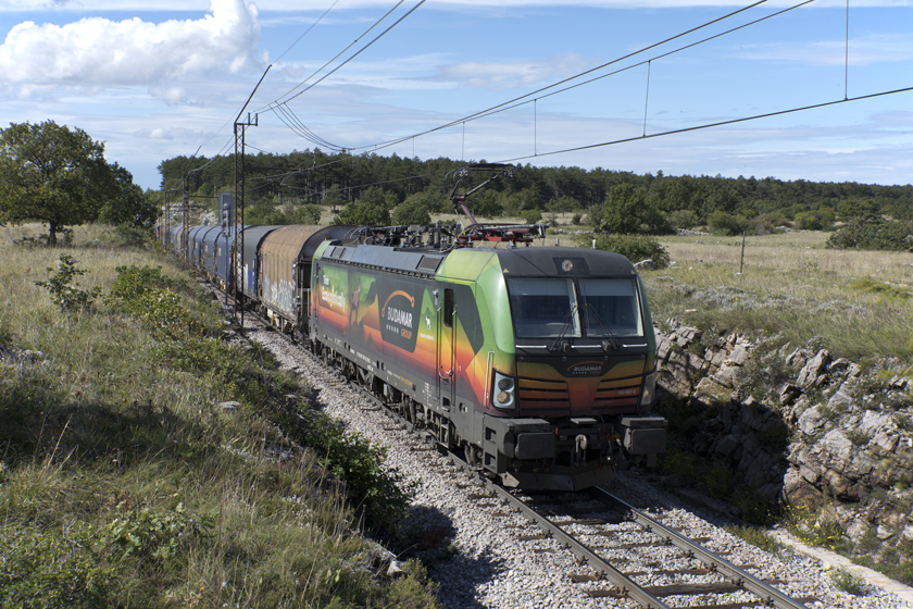 Vectron 193 807 is seen leading a steel train out of Koper between Crnotice and Prešnica - 26/09/2025