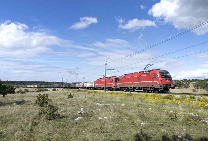 SZ 541 010 and classamte are seen leading a train of bogie boxes out of Koper between Crnotice and Prešnica - 26/09/2025