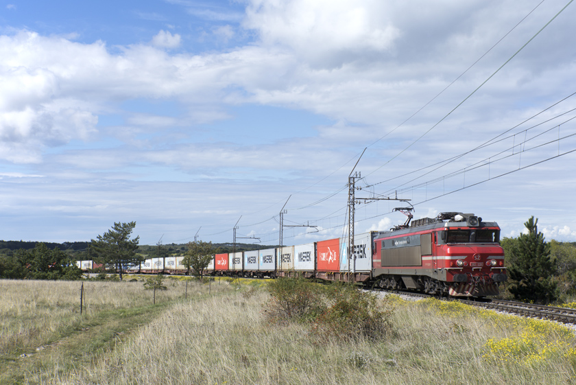 SZ 363 036 is seen leading an intermodal train out of Koper between Crnotice and Prešnica - 26/09/2025