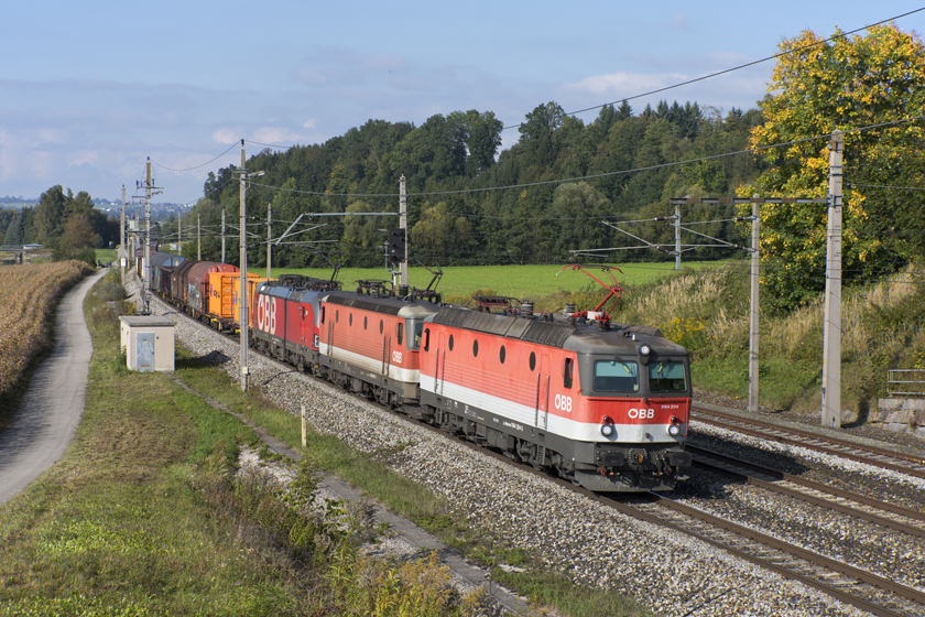 OBB 1144 207 and 1144 067 with a Vectron are seen leading a southbound freight at Wartberg an der Krems - 27/09/2025