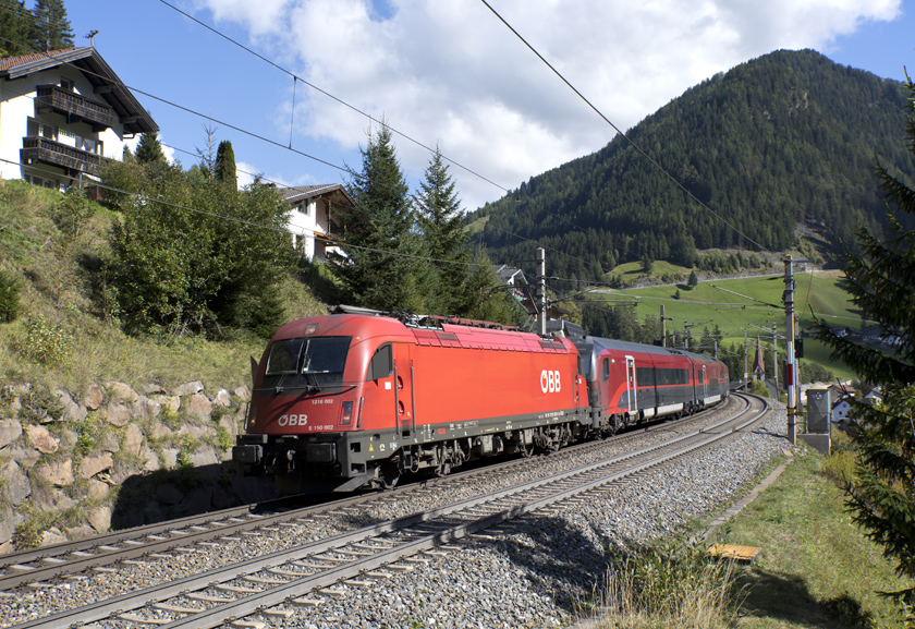 OBB 1216 002 is seen leading Railjet 86 09:52 Bologna-Munich north away from St Jodok - 28/09/2025