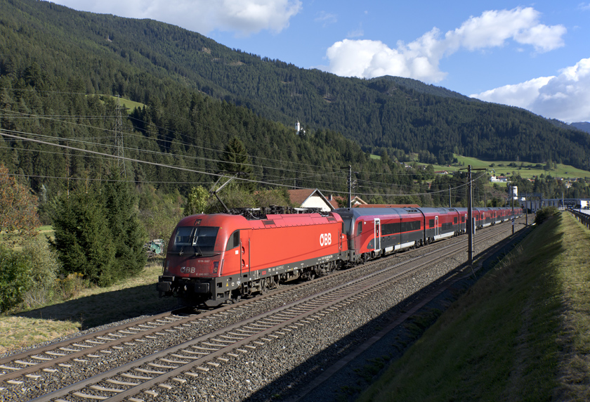 OBB 1216 007 is seen leading Railjey 84 11:35 Venice-Munich north away from Steinach - 28/09/2025
