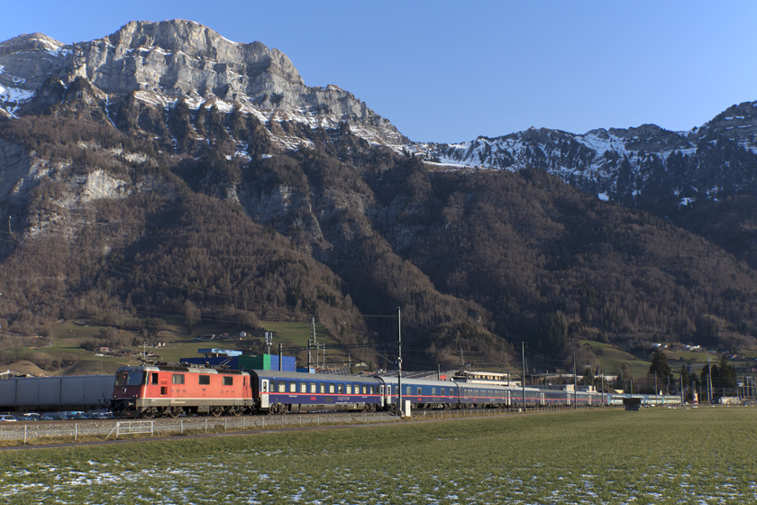 SBB Re4/4 II 11154 is seen leading NightJet 466 Vienna-Zurich west at Walenstadt running later than normal due to diversion between Salzburg and Buchs - 19/01/2026
