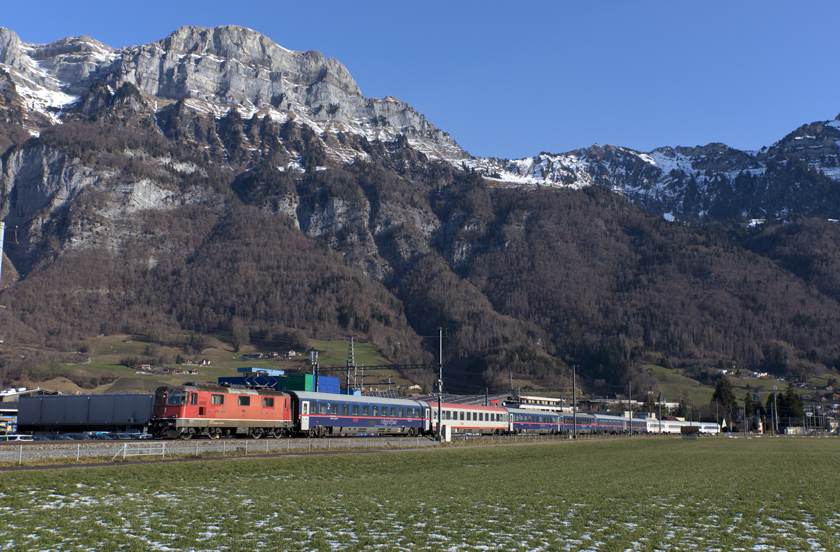 SBB Re4/4 II 11154 is seen leading NightJet 464 Graz-Zurich west at Walenstadt running later than normal due to diversion between Salzburg and Buchs - 19/01/2026