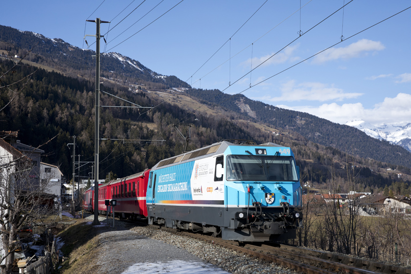 RhB Ge4/4 III 649 is seen leading a Chur-St Moritz IR south at Casiz - 19/01/2026