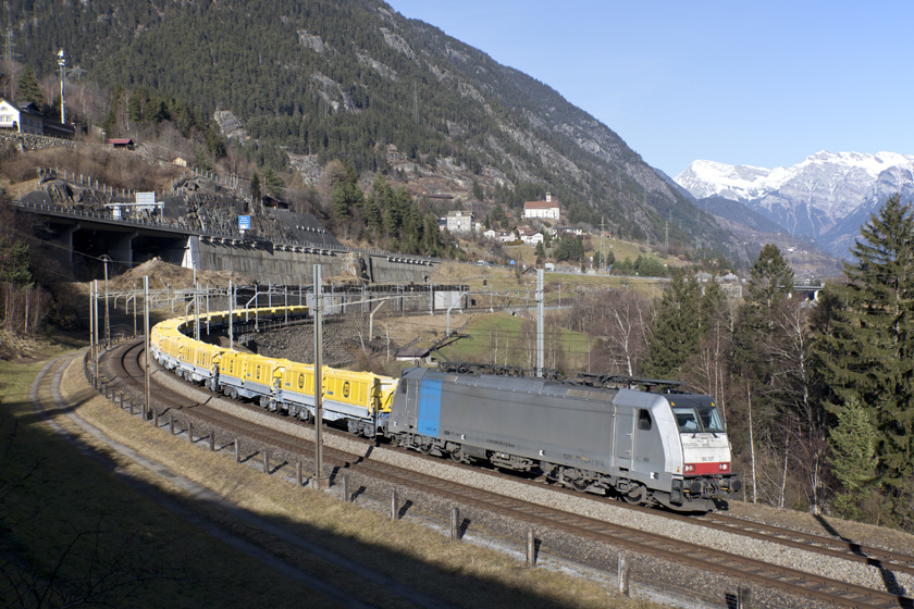 Railpool 186 507 is seen leading an empty Gotthard Road Tunnel spoil train upgrade at Wassen - 21/01/2026
