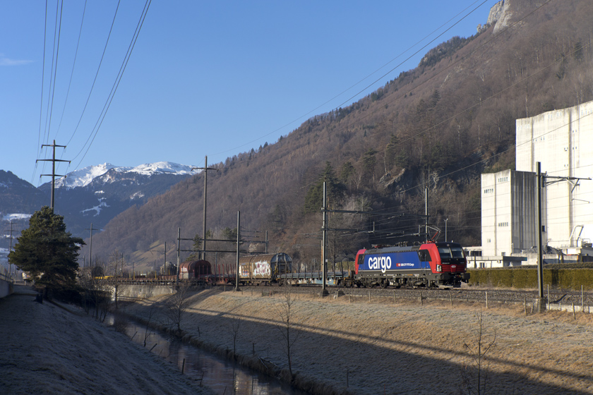 SBB Cargo Vectron 193 083 is seen leading freight 60265 Zurich RBL-Buchs SG north at Trübbach - 23/01/2026