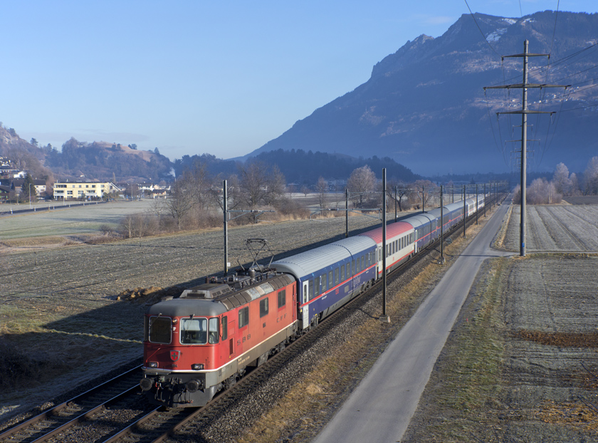 SBB Re4/4 II 11154 is seen leading NightJet 464 Graz-Zurich south at Weite running later than normal due to diversion between Salzburg and Buchs - 19/01/2026