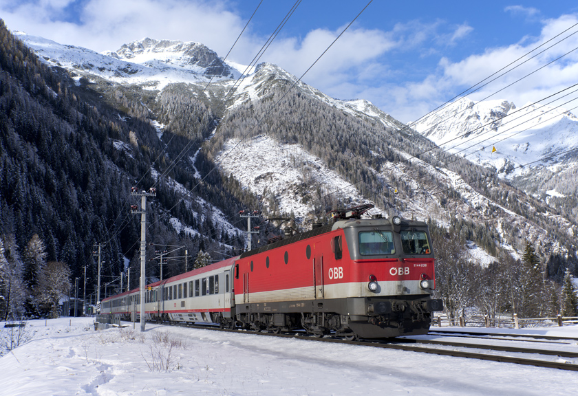 OBB 1144 036 is seen leading IC795 13:06 Salzburg-Villach out of the Tauern Tunnel the nearing Mallnitz - 26/01/2026
