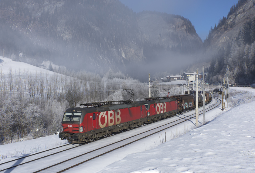OBB 1293 037 and 1293 043 are seen leading a southbound freight near Klammstein just as the morning mist started to clear - 27/01/2026