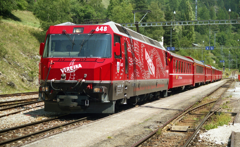 RhB Ge4/4 III 648 is seen at Filisur with a St Moritz-Chur IR - 13/7/2003