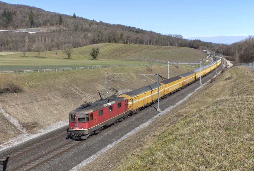SBB Re4/4 II 420 324 (11324) is seen leading 50012 Zürich Mülligen-Genève mail west at Concise - 24/02/2026