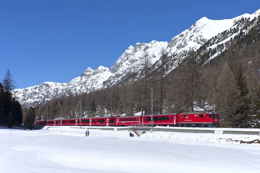 RhB Ge4/4 II 629 is seen leading a Chur-St Moritz nearing Bever - 25/02/2026