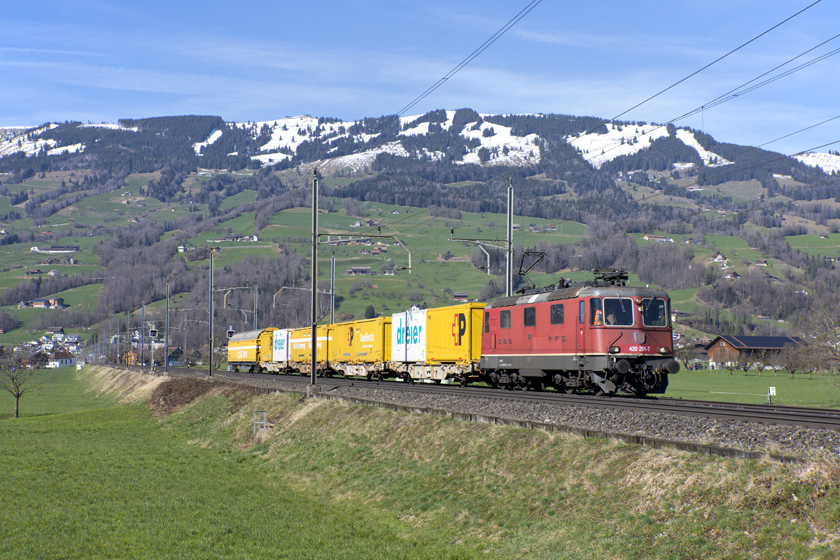 SBB Re4/4 II 420 291 (11291) is seen leading mail 50021 Harkingen-Cadenazzo south at Steinen - 26/02/2026