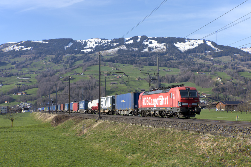 DB Vectron 193 338 is seen leading a southbound intermodal at Steinen - 26/02/2026