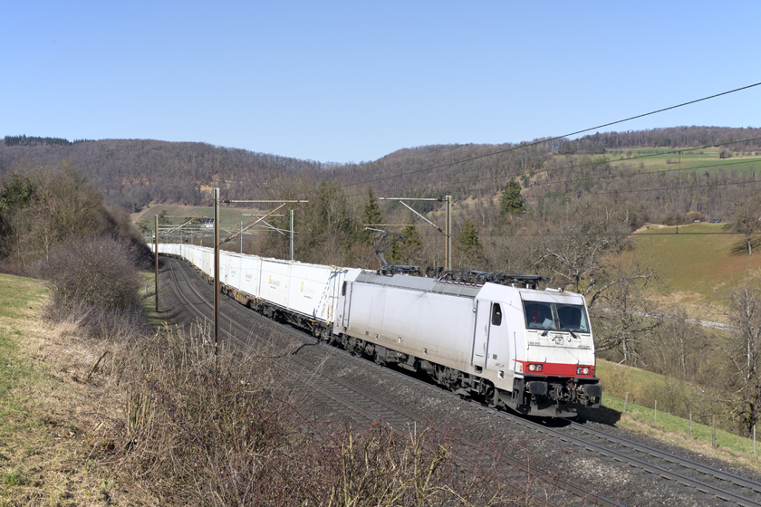 Akiem 186 910 is seen leading a matching eastbound intermodal at Hornussen - 27/02/2026