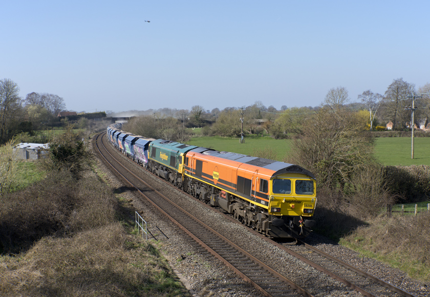 59205 and 66557 are seen leading a late 6A50 Whatley-Hanwell Bridge Loop east at Great Cheverell - 19/03/2026