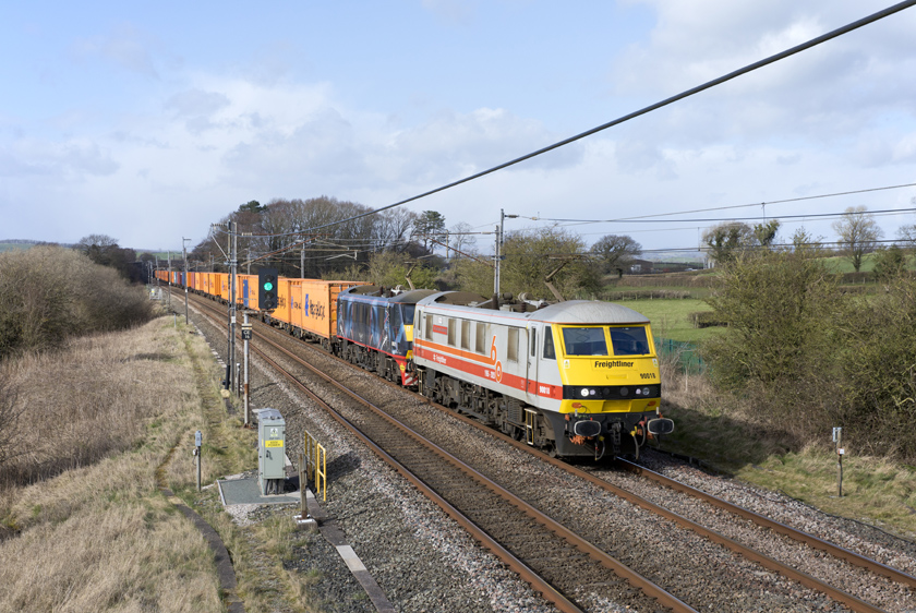 90018 'The Greatest Gathering' and 90021 are seen leading 4M83 Coatbridge-Crewe south at Elmfield - 28/03/2026