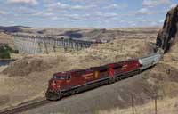 WAMX GP40 4043 (formally Penn Central/Conrail and Amtrak) is seen leading freight to Hooper Junction from interchanging the UP at Ayer Junction near LyonsFerry, Wa - 08/09/2013 |  CP AC4400CW 8517 is seen leading a westbound grain train from North Dakota (via Canada over Crowsnest Pass) rounding the curve having just crossed Joso Trestle near Lyons Ferry, Wa - 08/09/2013 |  CP AC4400CW 8509 is seen leading a Eastport, ID to Hinkle, OR Manifest (M-ETHK) south on Joso Viaduct over the Snake River in the last minutes of evening light - 08/09/2013 |  St Maries River Railroad SW1200 #501 is seen making up the Plummer turn at St Maries, Id - 09/09/2013 |